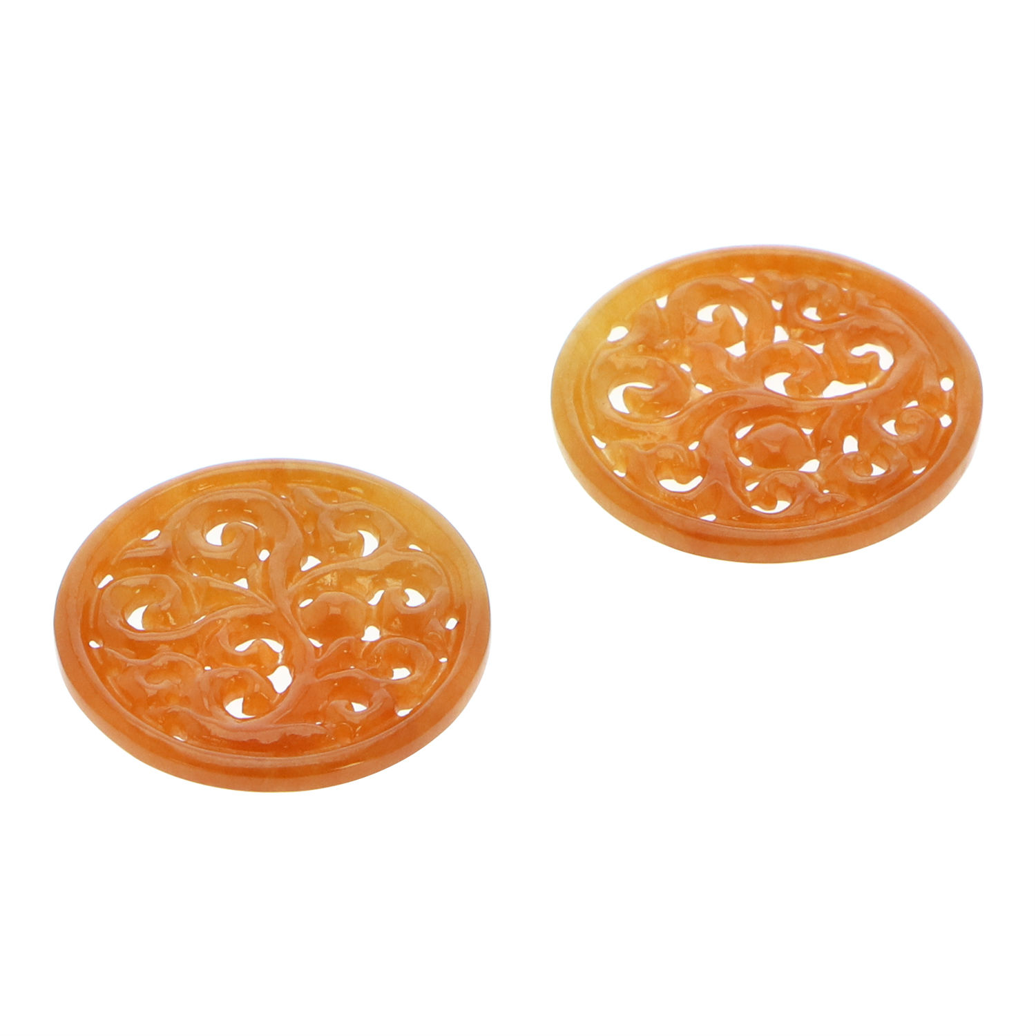 Delicate and oriental in essence, these round jadeite jade earrings are embellished with meticulously arranged swirl carvings for a feminine and refined appeal. The beautiful pair is crafted from natural type A orange jadeite jade mined in Myanmar, so it emits a vibrant and luminous glow. Bring an exotic and oriental flair into daily edits with this lovely and unique number.