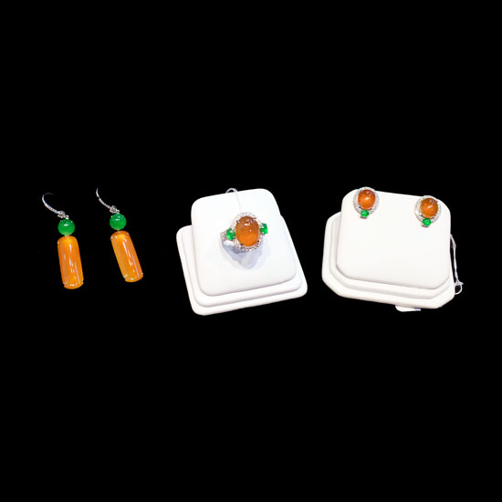 This is a series of jewelry that comes with a finger ring and two pair of earrings. Each piece is adorned with a brown jadeite stone and two green jadeite stones for an attractive look. These jewelry pieces are great accessories for your chic outfit.