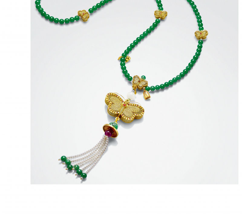 Blended with multiple elements of Buddhism, this sumptuous necklace exudes luxe and grace with a harmonious mix of jadeites, nephrite, gold, pearls and rubellite. The jadeite beads strand is interspersed with openwork gold-wired butterfly embellishments and gold gourd, which is further accented with dangling monastery bell, butterfly fragrance sachet, and bead tassel for enhanced delicacy. Accessorize your evening look with this gorgeous one wrapped around your neck.