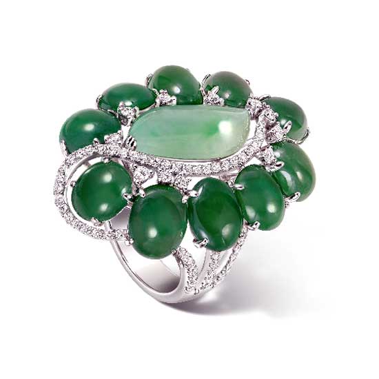This gorgeous ladies’ ring features a flower appearance adorned with luminous jadeites. The sparkling stones jazz up the design with aristocratic grace. This bold and captivating jadeite ring is sure to steal the spotlight at cocktail parties.