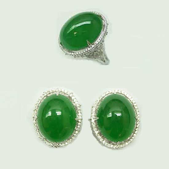 The exceptional ring and earrings are centered with stunning jadeite oval cabochons of even vivid emerald green with high translucency. They are mounted on the gleaming 18K white-gold construction for endless beauty and luxury. The surrounded brilliant-cut diamond shines with dazzling brilliance.