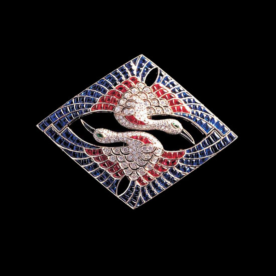 This is an Art Deco-styled double clip made from selective sapphires and rubies. It depicts two Japanese cranes embracing each other. It brings out your unique personality without sacrificing your beauty.