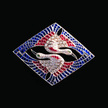 Multicolored Art Deco Double clip depicting Japanese Cranes in flight.