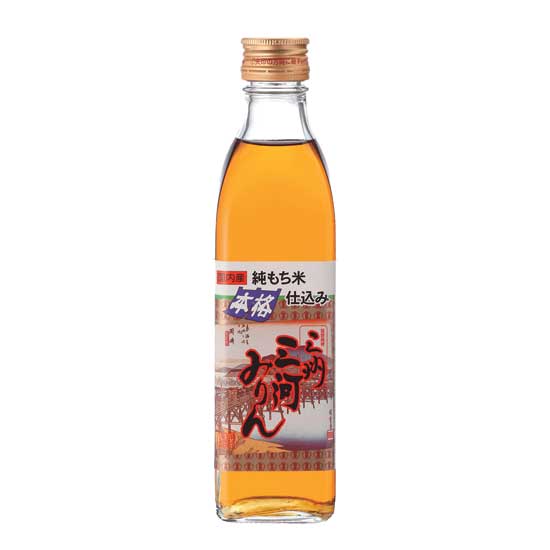 Displayed is a type of Japanese rice wine called mirin. Sanshu Mikawa mirin is authentic mirin with the good taste of glutinous rice extracted only by a traditional brewing technique from ancient Japan. It features a chic and sharp sweetness and good luster and gloss. Moreover, it is full of deliciousness and richness that set off the natural flavor in cooking ingredients.