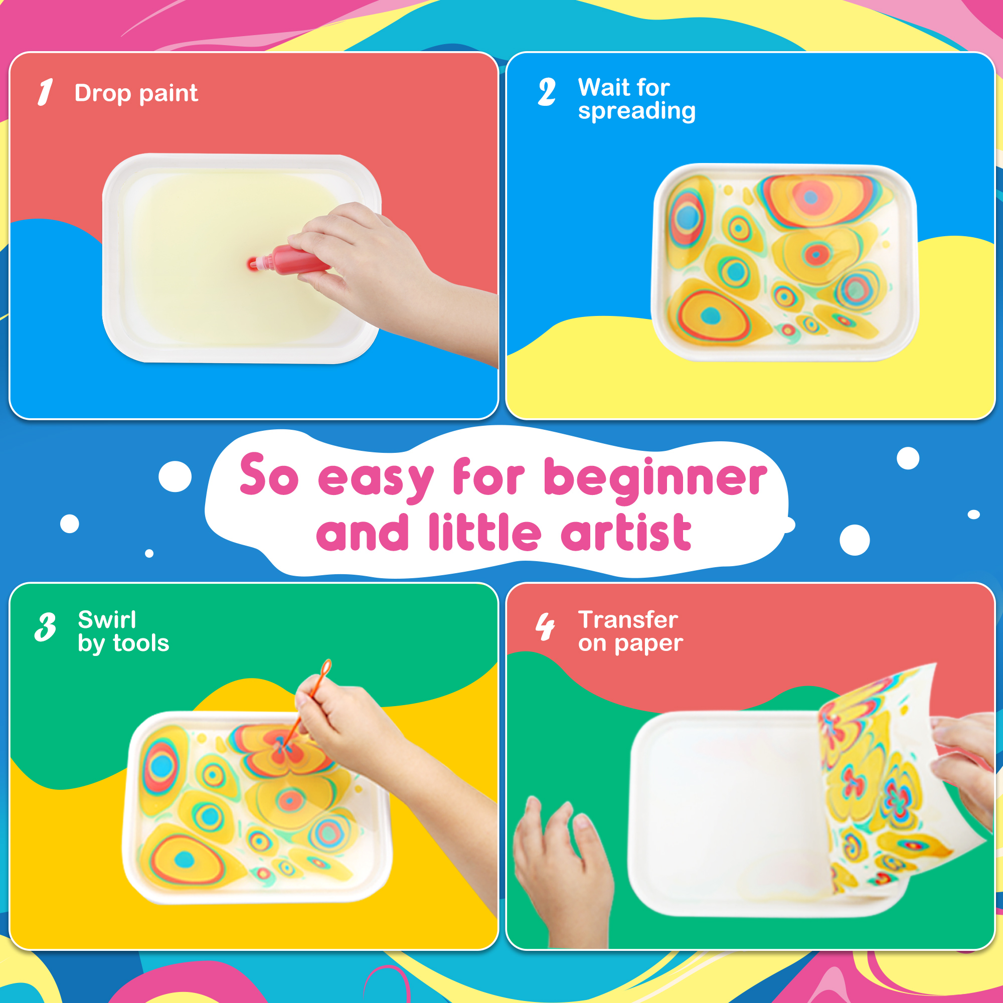 【Easy & Unique Painting】 No need for painting foundation, the water art paint set is suitable for kids in all ages and adults. Follow the instruction booklet, drop the paint on the drawing liquid, swirl to any pattern and transfer it on paper. So beautiful marble painted art, creative & fantastic water art kits.