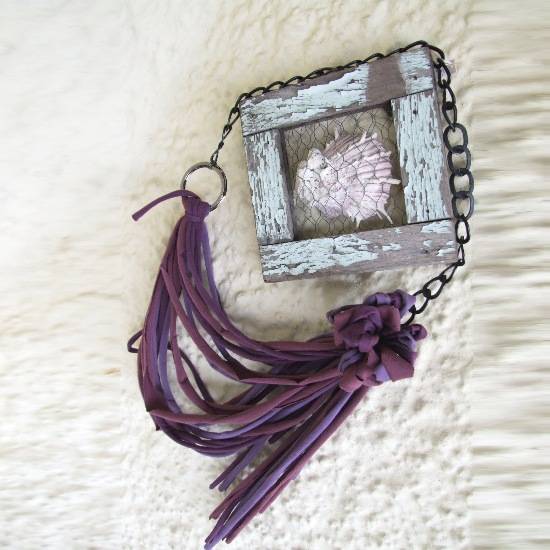 The stylish necklace features a bunch of jersey knitted strands in two tones of violet. The two ends of the strands are tied to a metal chain asymmetrically with blossomy knots. The chain consists of delicate interlinking rings which create an adorable contrast with the velvet jersey front. This avant-garde necklace best suits trend-setting ladies.