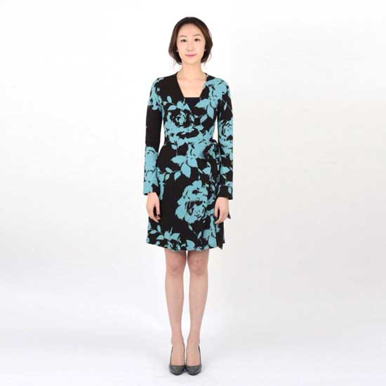 This is a women's wrap dress that comes in a fashionable design. The black body is decorated with blue flowers, which adds a touch of elegance to the piece. In a wrap style, this close-fitting dress showcases a flattering curve.