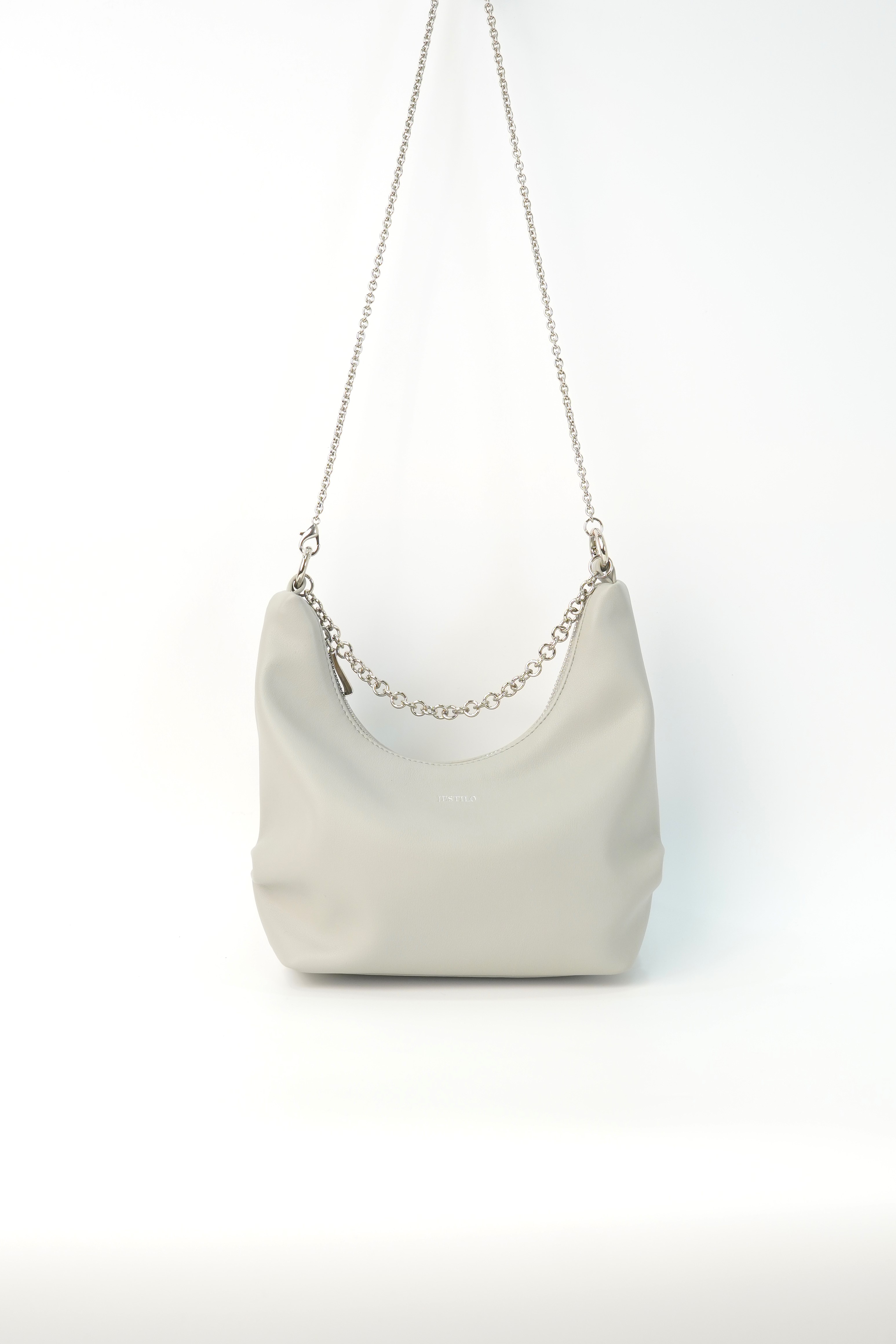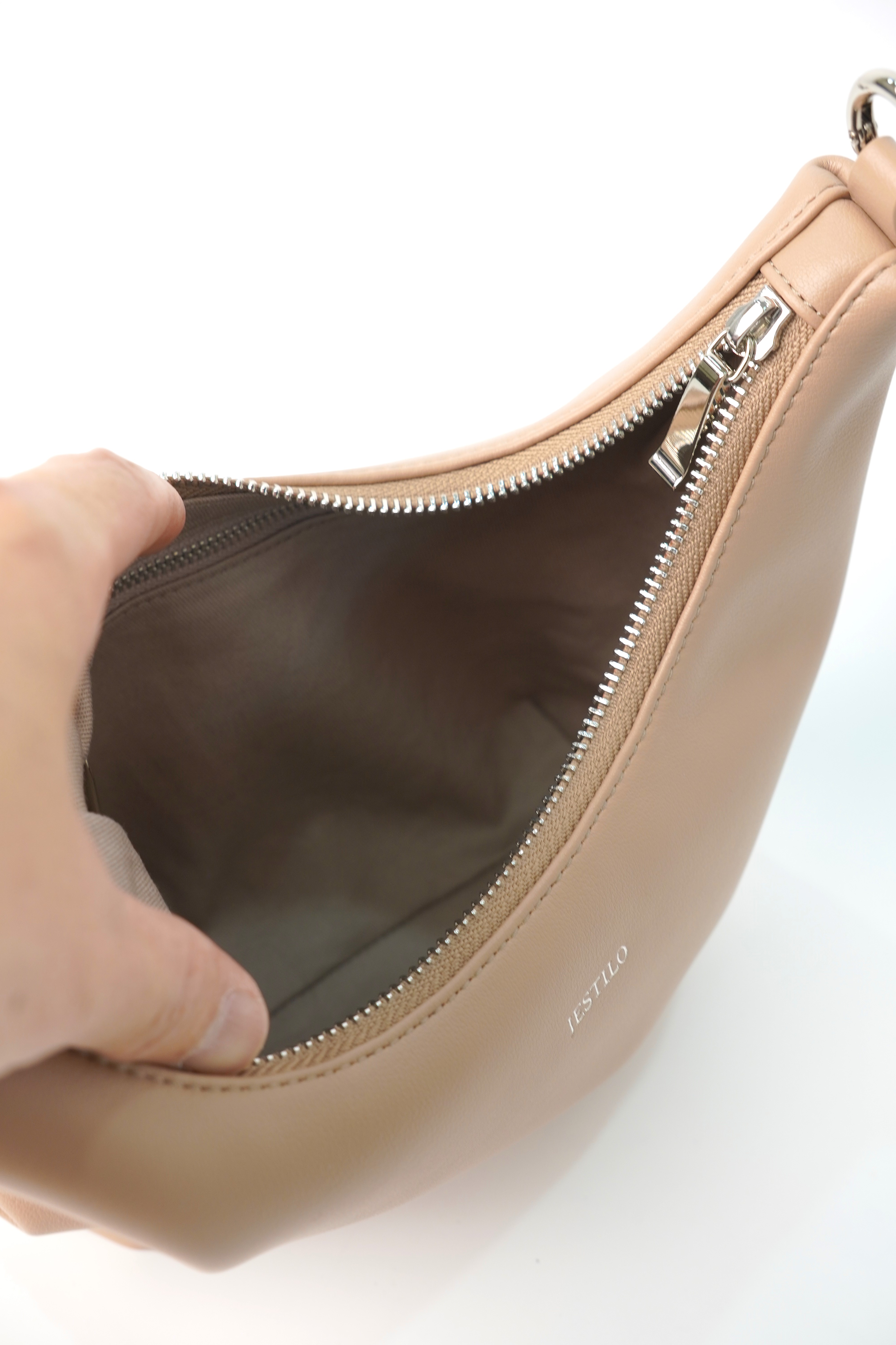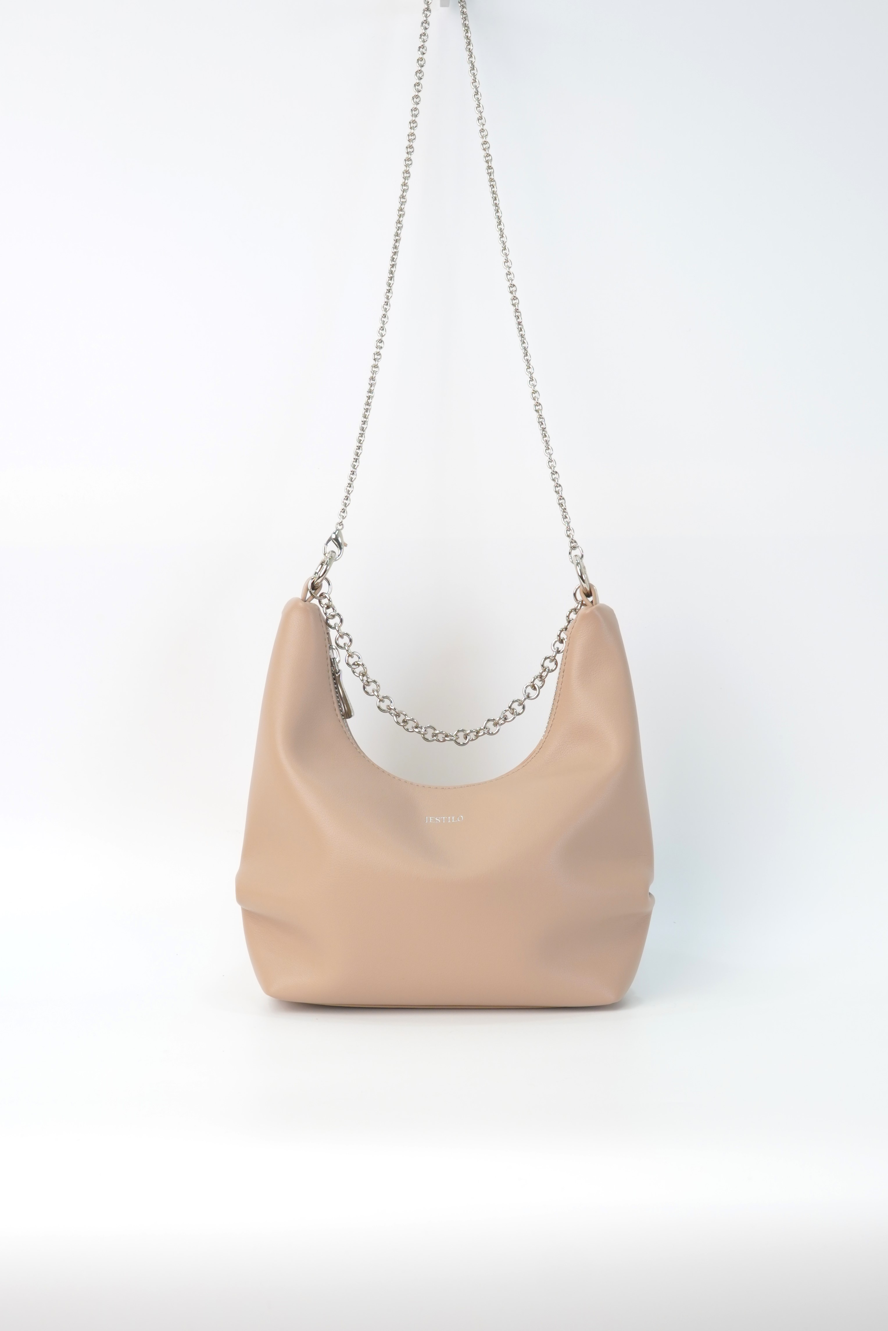 This genuine cowhide leather half-moon bag boasts a sleek, curved silhouette in a warm light tone. Equipped with a polished silver chain strap, it supports multiple wearing ways—handheld, shoulder or crossbody—for flexible styling. The top zipper closure ensures safe storage, while a built-in inner pocket helps keep daily essentials tidy. With its minimalist design and buttery-soft texture, this elegant half-moon bag is a perfect daily companion for effortless elegance.