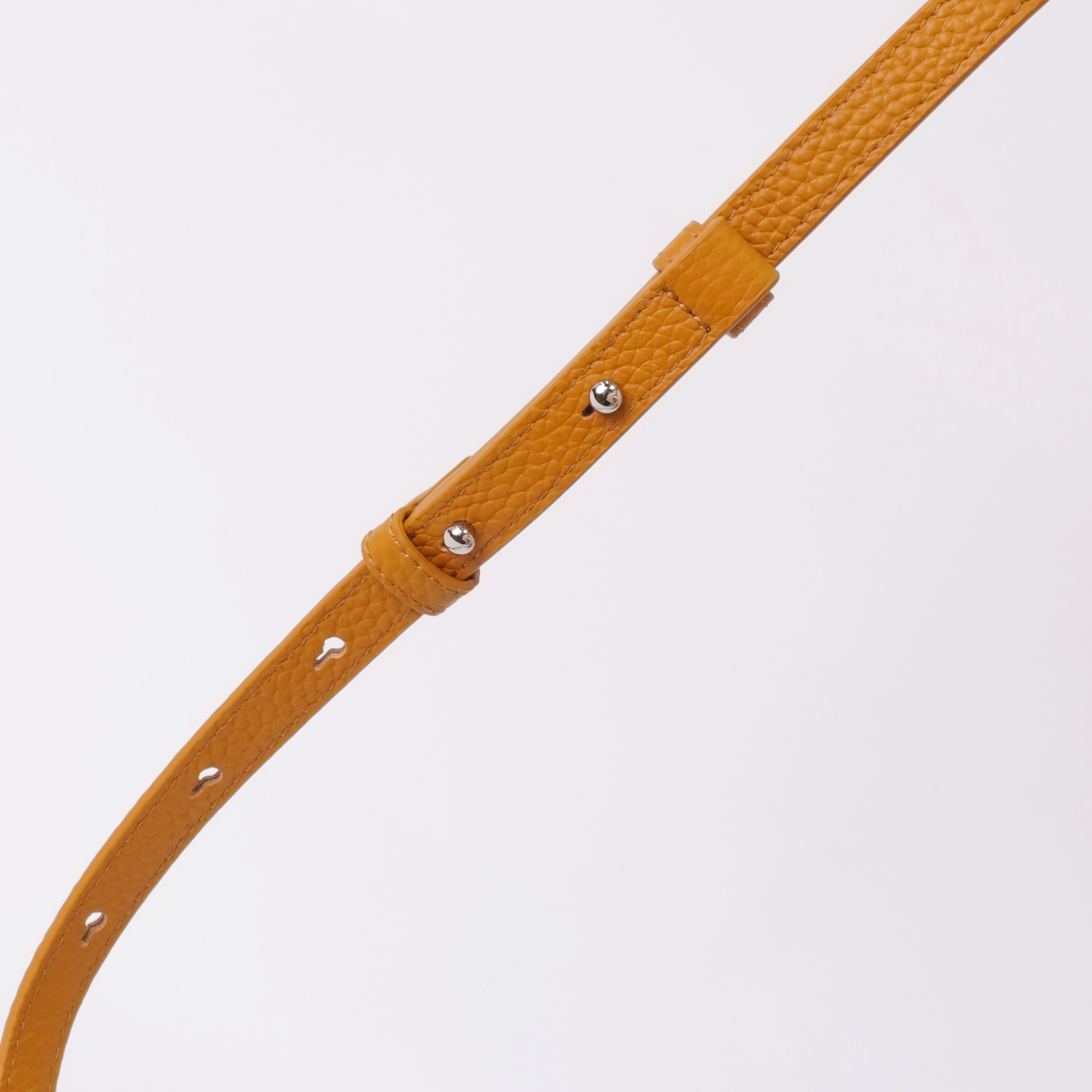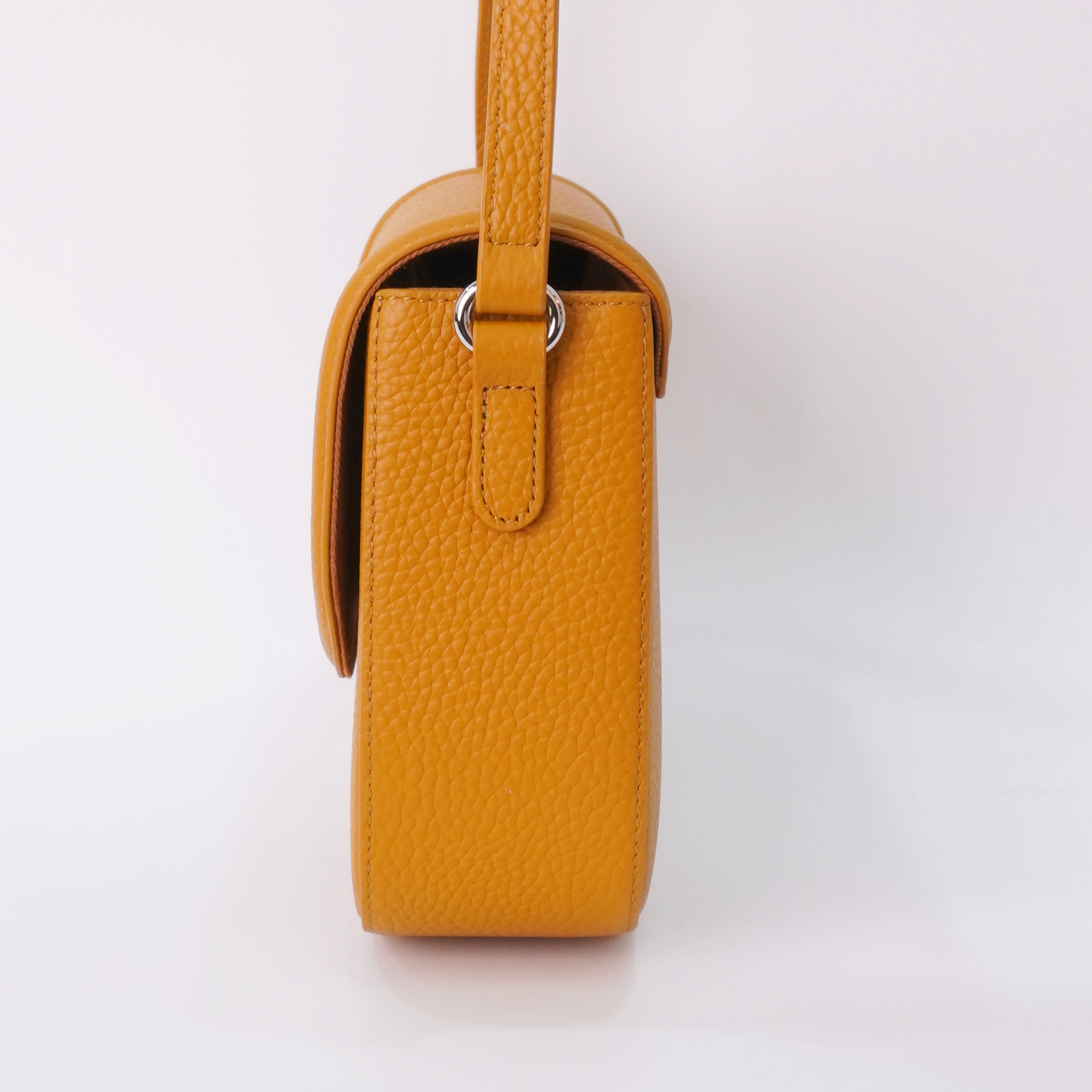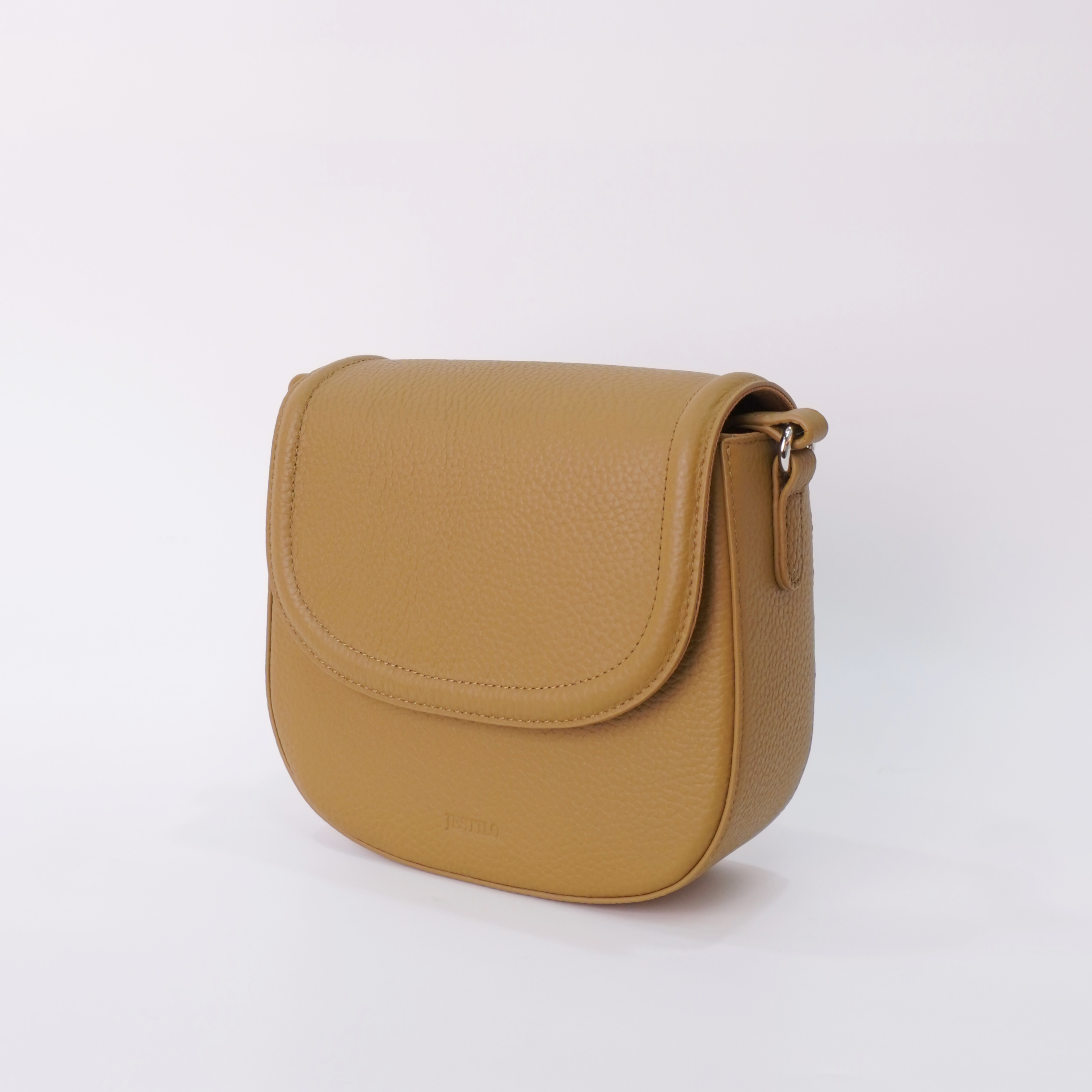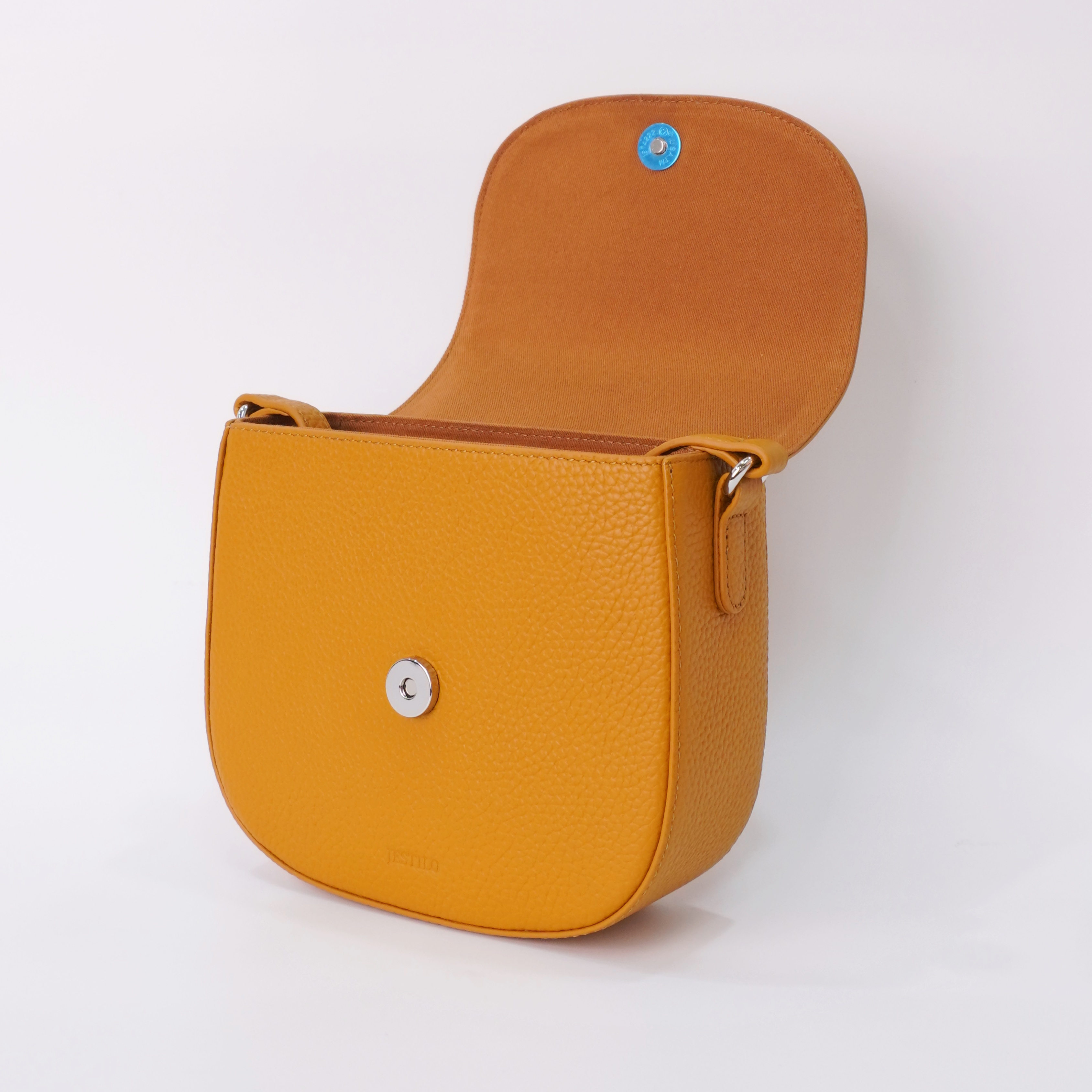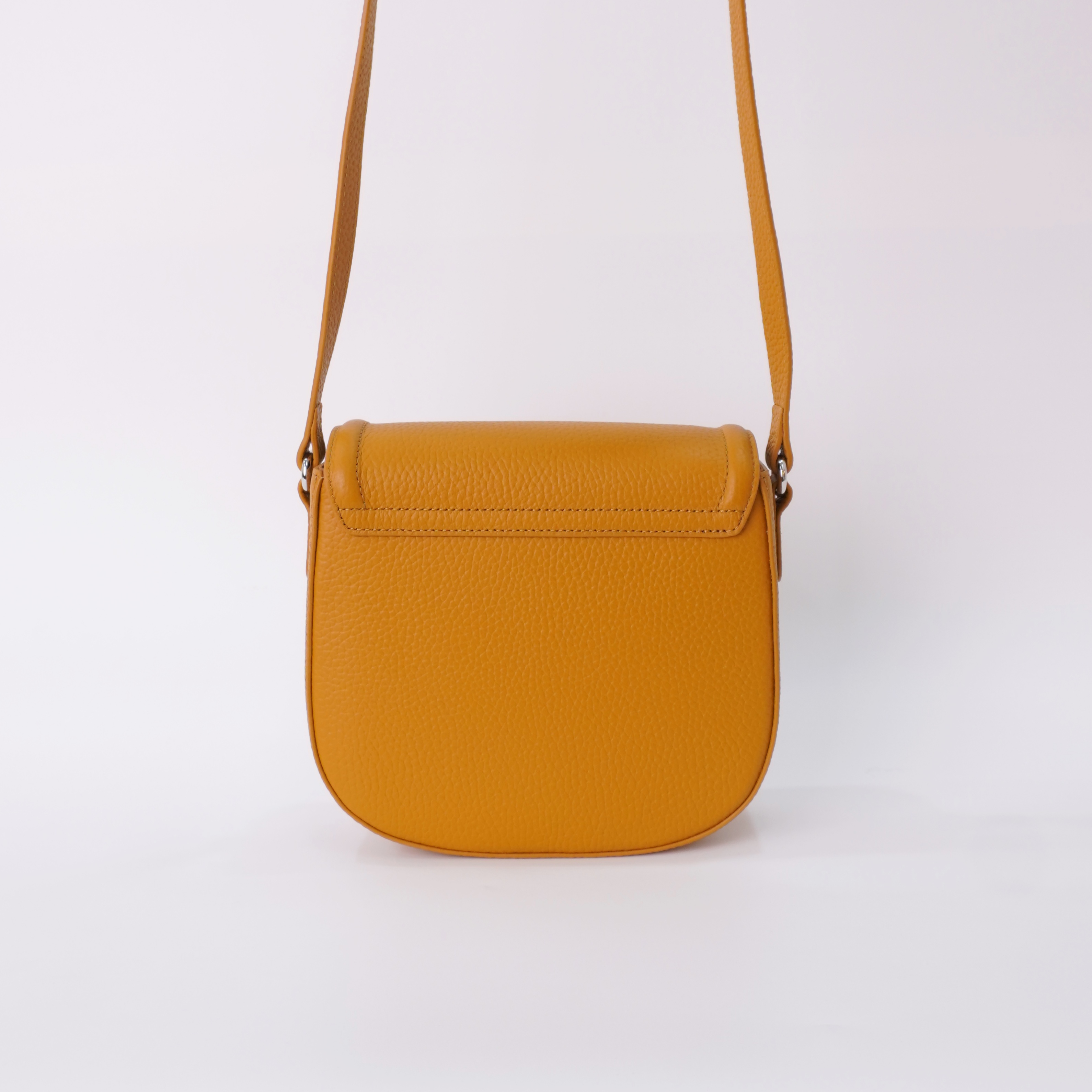 Crafted from premium pebbled cowhide leather, this warm mustard-yellow saddle bag combines timeless style with everyday practicality. Its compact, curved silhouette features a secure flap closure and an adjustable shoulder strap, making it perfect for crossbody wear. The clean stitching and minimalist design add a touch of understated elegance. Ideal for carrying your daily essentials with effortless charm.