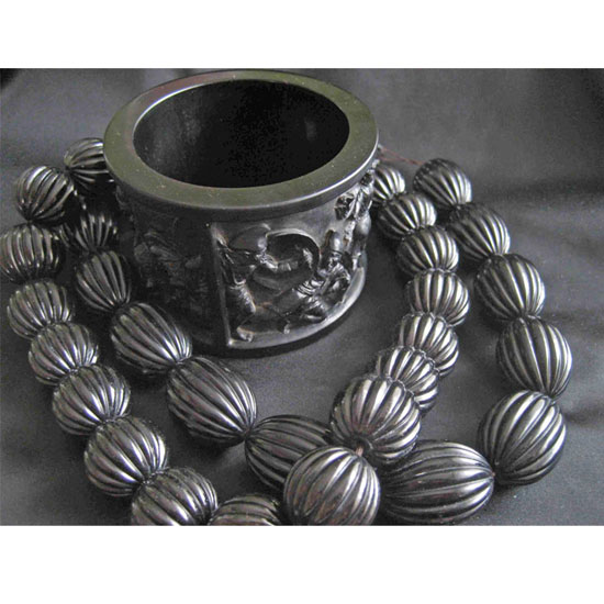 Presented is a bangle and a necklace made out of jet (fossilized wood), an organic material which is light and warm to the touch. The jewelry is delicately carved by hands and exhibits appealing grooves. It enriches your ensembles with a dash of elegance and uniqueness.