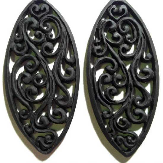 Displayed is a pair of earrings that is hand-carved from jet. Featuring exquisite details in an eclipse shape, this pair of jet earrings showcases a timeless sense. This beautiful pair of jet earrings is a unique addition to your jewelry collection.