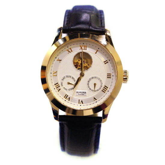 This automatic watch comes with a polished golden case for a luxurious touch. The round dial features classy embossed Roman numerals, flaunting a luxurious style. The small round skeleton part showcases an unmatched design.