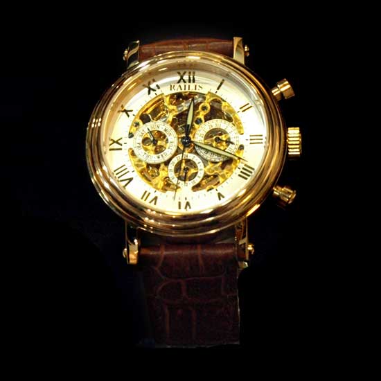 This automatic watch comes with a round skeleton dial with beautiful Roman numerals. The automatic movement is manufactured with jeweled bearings for high precision. The polished triple-rim bezel showcases an elegant design.