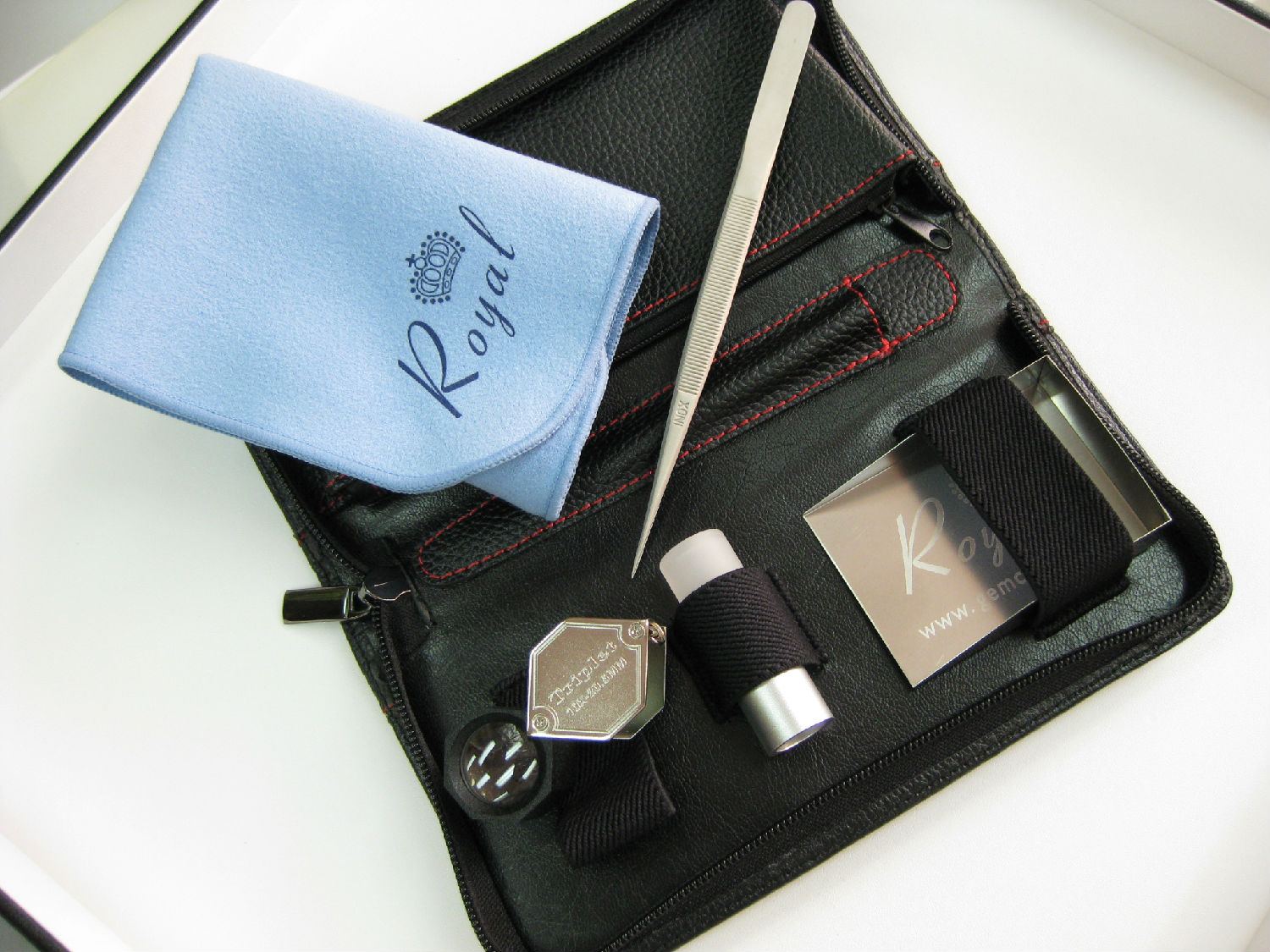 Leather tool pouch with tweezer, loupe, scoop, mini H&A viewer & diamond cloth