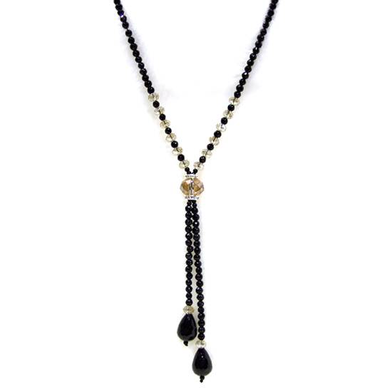The high-fashion necklace comes with two pendants. The two black pendants are made of small black crystals and a large pear shaped crystal. There is also a semi-transparent crystal decorated on the middle and the necklace is chained by yellow and balck crystals.