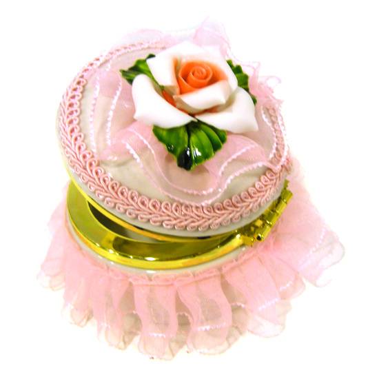 The featured item is a jewellery box made of ceramic. The lid is decorated with ceramic flowers which are delicately coloured to give it a realistic look.