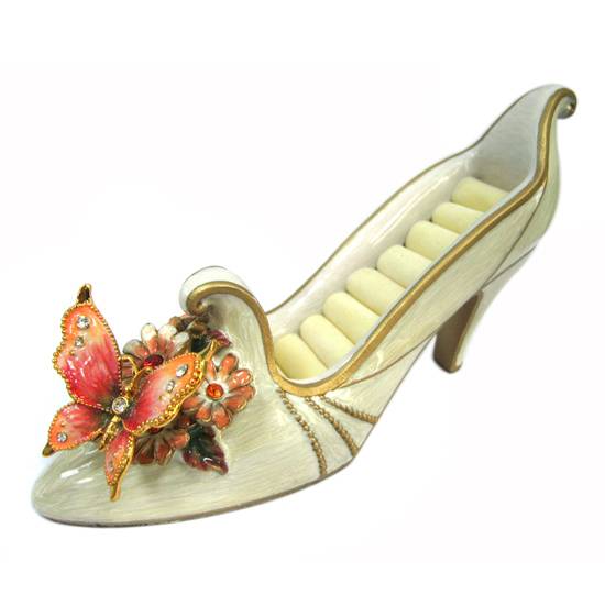 This is a ring holder which is designed as a ladies' high heel shoe. The ring holder is decorated with botanical design.