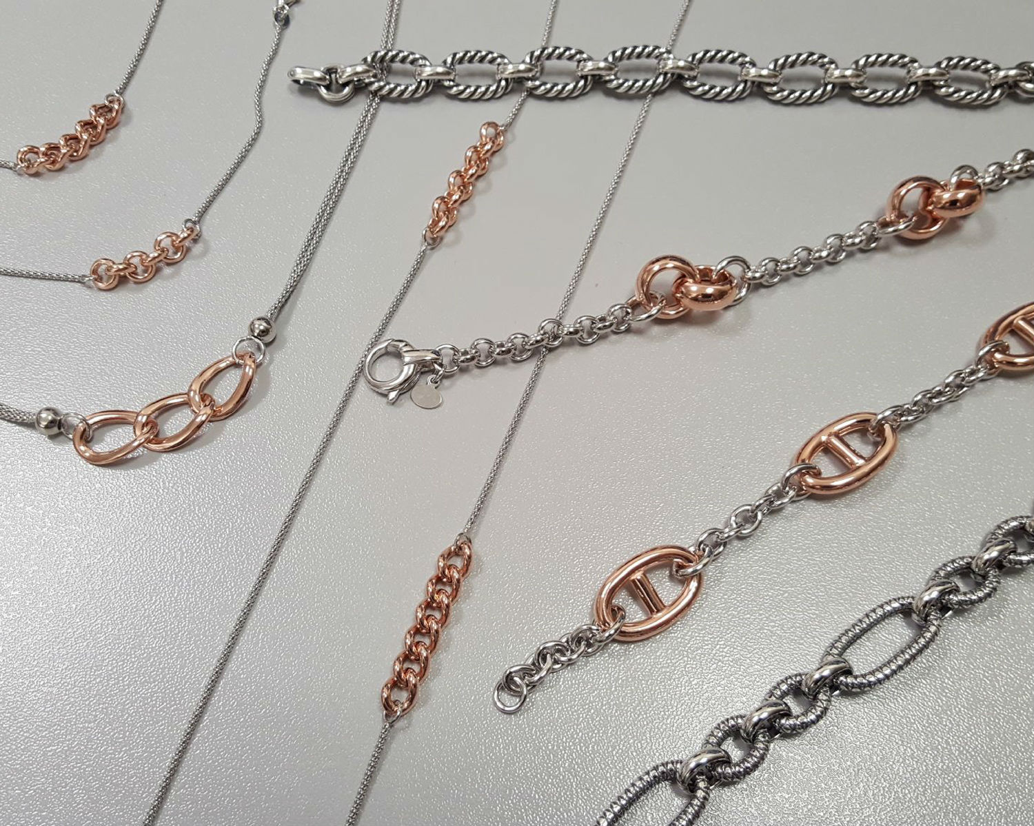 Original gold 2000 offers a big range of sterling silver jewellery for men and woman. His line includes silver necklaces, bracelets, anklets, ear-rings and pendants from various styles to fit different markets. We pass from simple basic silver chains to classic fancy silver lines with swarovski crystals, cast pieces and enameled elements.