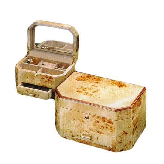 This is an elegant wooden jewelry box with compartments in different sizes. It has bars for rings on the inside top desk and one drawer on the lower desk. With a glossy finish, this jewelry box is a good choice.