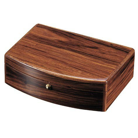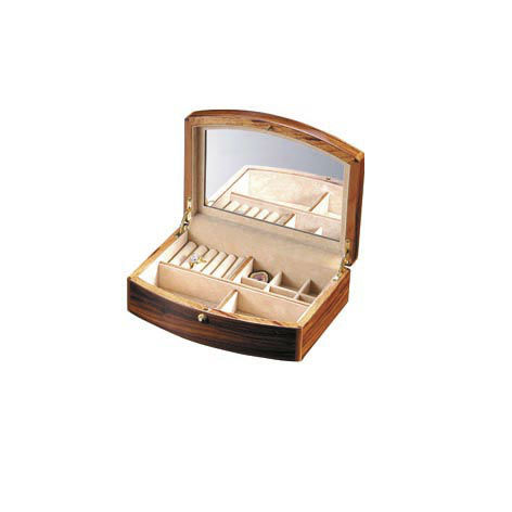PE piano finish jewelry box in genuine brazilian rosewood veneer. Inside with nice cream color felt, with mirror and compartments for rings and jewelry. Also come with brass tone finish push lock