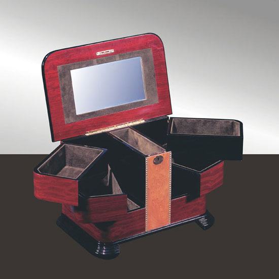 This is a multifunctional jewelry box with a sophisticated structure. It features eight individual compartments for keeping assorted jewelry pieces in organized. The cover features a rectangular mirror inside for added convenience.