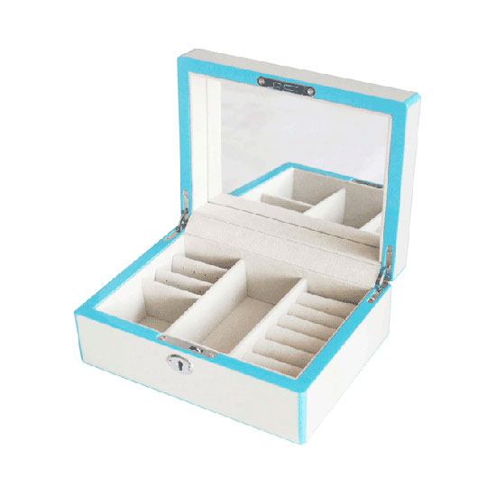 This is a quality jewelry box with an elegant appearance. It boasts a robust housing for a long service life. This jewelry box features multiple storage compartments, a key, a lock and a mirror.