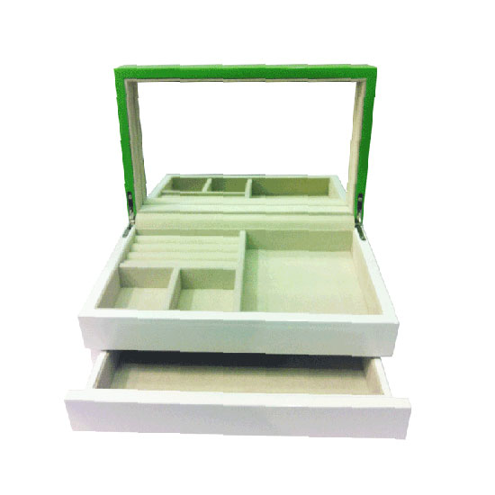 This is a quality jewelry box with 2 layers, 1 drawer and a mirror. It is made of top-grade materials for a long service life. This jewelry box is an ideal addition to your modern household.