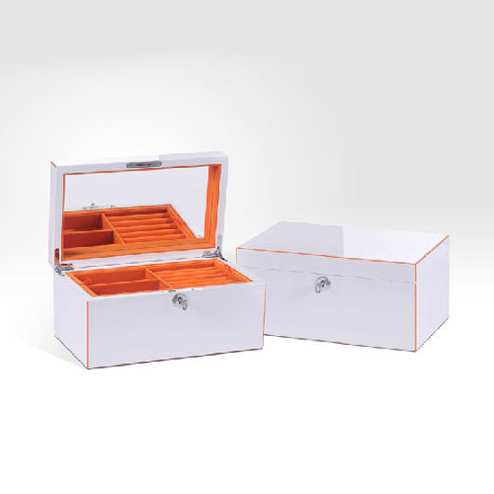This is a jewelry box in a rectangular shape with white plating. It features a wooden structure with a high-gloss finish. This box comes with multiple compartments inside for keeping assorted jewelry items organized.