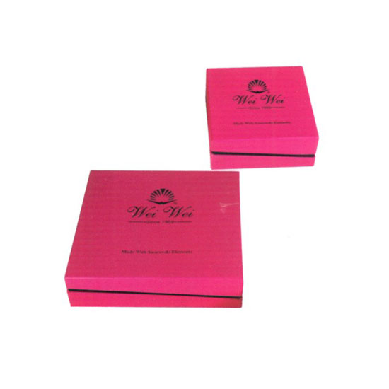 This is a jewelry box designed in a quadrilateral shape. It features a pink exterior with black prints. This box is great for packaging different jewelry pieces.