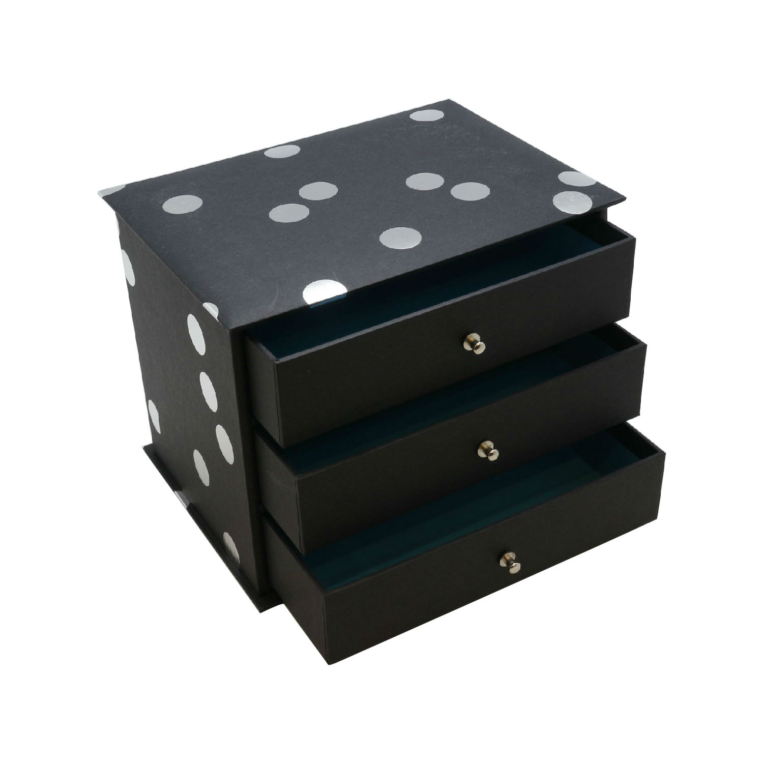 The highlighted jewelry box is made of cardboard and is adorned with black and silvery foil dots on the exterior. It has 3 drawers for storage and has knot handles for pulling the drawers. This jewelry box flaunts a sturdy construction and provides organized storage for your precious jewelry.