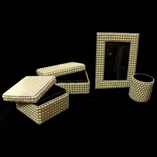 This jewelry box set comes with jewelry boxes, a photo frame and a pen holder. The robust housing is beaded for added attractiveness. This set is a nice choice to be added to your stylish household or office.