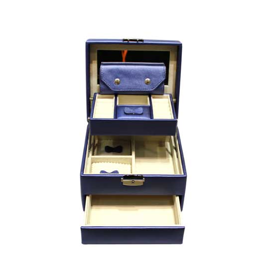 This is a jewelry case that is finely made of cardboard and fabric for enhanced durability. It is designed with three drawers which have different compartments to store your jewelry pieces in place. The metal lock system with an easy-to-operate mechanism ensures easy opening and closing.