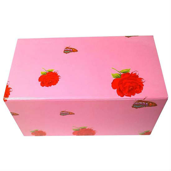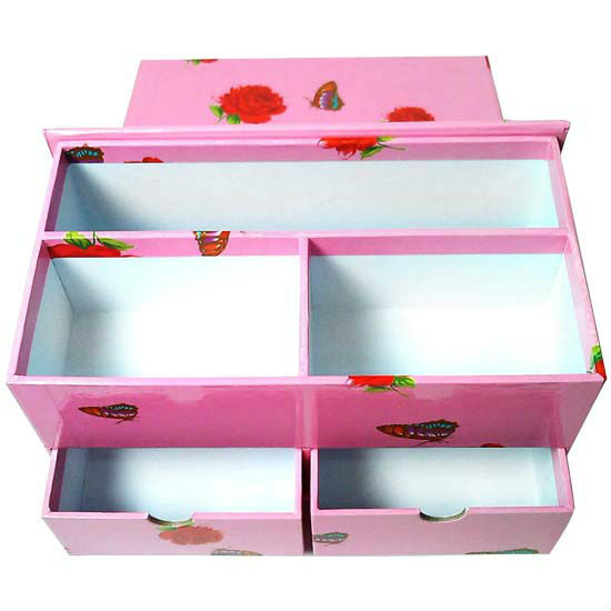 This rectangular shaped jewelry case is rectangular shaped and features a two-layered design. There are three compartments on first layer and two drawers on second layer. Its pink appearance with flowers and butterflies printing enhances a sense of girlishness.