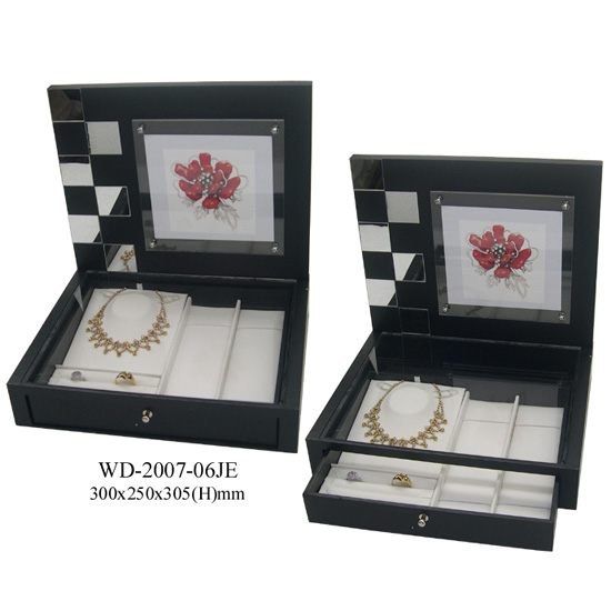 This is a jewelry showcase unit crafted with fine light wood and covered with leather. It features a stand-up board with a picture frame for placing small poster, while the pull-out drawer below has a transparent top to display your jewelry beautifully. The drawer consists of necklace and bracelet compartments, and two ring slots are designed to hold rings securely.