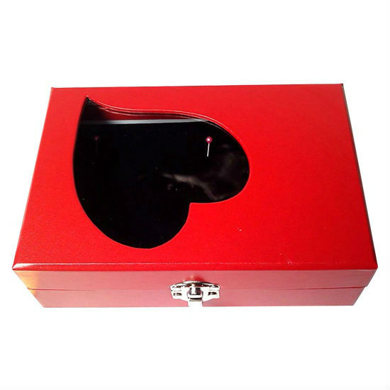 This jewelry box comes in an eye-catching red appearance and has a heart-shaped transparent window on top. The metal silvery lock closure enhances security of this box. It is great for storing jewelry, keepsakes, stationeries, memos, and more.