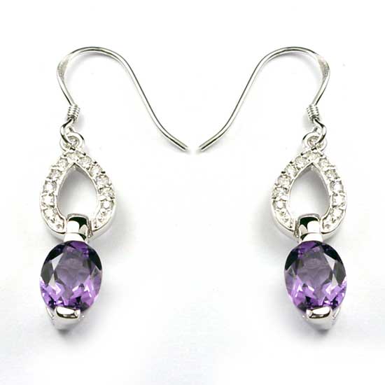 This is a pair of jewelry earrings with polished purple stone decorations that are fancy yet elegant. The plated frame is decorated with shimmering stones, which builds a sophisticated look. This pair of jewelry earrings is an ideal piece to embellish ladies' apparel.