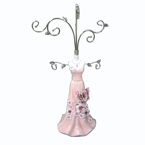 This jewelry hanger features a base with the appearance of an evening gown. The graceful curves allow you to hang your necklaces or drop earrings. It makes a stunning display with practical function.