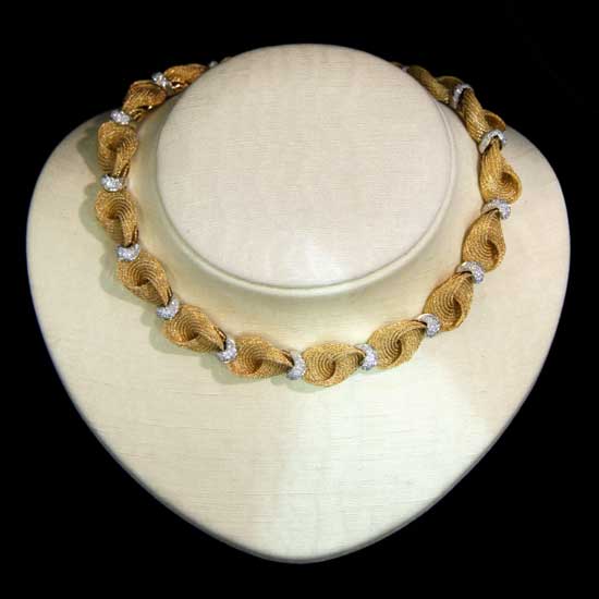 This gorgeous necklace features a dazzling 18K yellow and white gold construction. It boasts a braid-like design with sparkling diamonds for a touch of uniqueness. Add this stylish necklace to your jewelry collection.