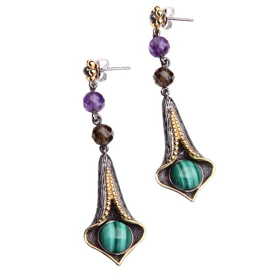 Shown here is a pair of well-crafted jewelry earrings. Jewels of different colors are used to create a sophisticated, ancient look. A pendant structure adds a feminine touch to this stylish jewelry.