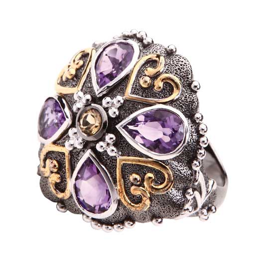 This elaborate jewelry ring is characterized by an ancient charm. Purple jewels shaped as a tear-drop look stunning together with golden heart-shaped patterns. This crafty and stylish ring makes an extraordinary accessory for ladies.