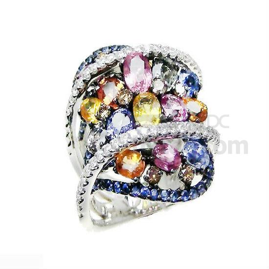 This cocktail ring is sparkled with variously shaped and sized rhinestones in shades of yellow, pink and blue color. The 18-karat white gold band is encrusted with gleaming white diamonds for added opulence. Style yours with a strapless metallic dress and a chrome manicure for a futuristic finish.
