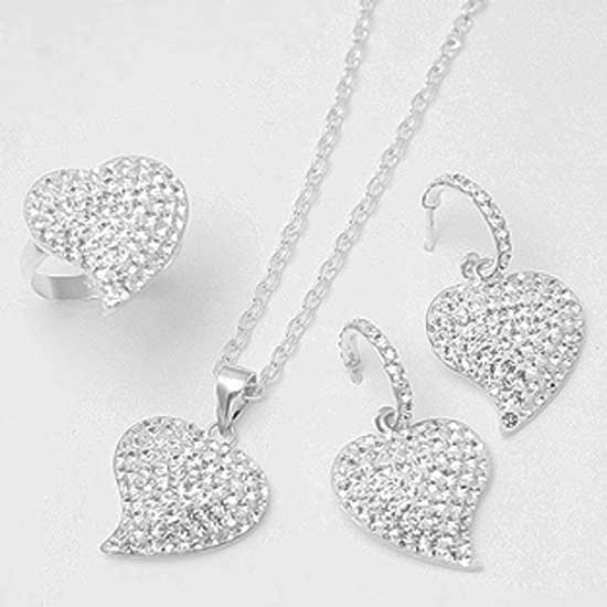 The jewelry set designed for ladies includes a pair of earrings, finger ring, etc. The items feature heart-shaped designs with slightly tilted bottoms. They are also richly bespangled with glittery trimmings.