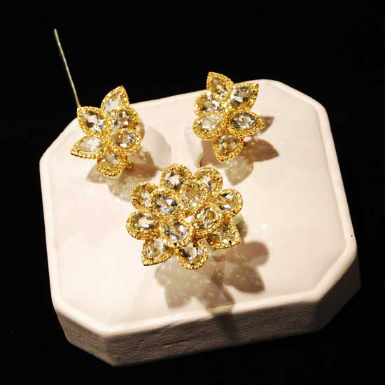 Presented is a jewelry set that offers a ring and a pair of earrings. The set are well made of colored stones to interpret a florid, eye-catching style. The alluring sparkling details are sure to melt any ladies’ heart.