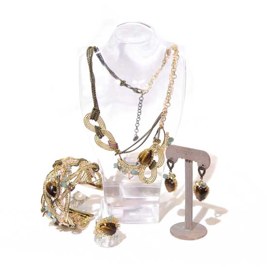 This four-piece jewelry set includes a bangle, a ring, a necklace and a pair of earrings. The tasteful jewelry pieces are finely crafted from brass, tiger eye stones and other semi-precious stones. The dainty jewelry set will add glamor to any ladies' evening look.