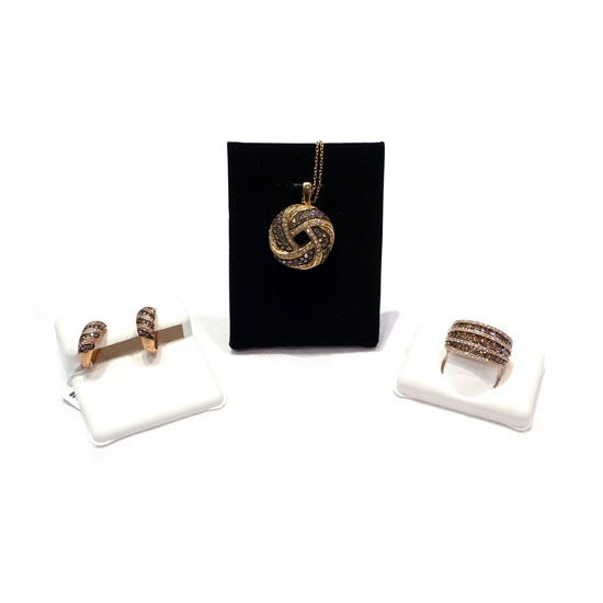 This is a set of jewelry that comes with a finger ring, a pair of earrings and a necklace. Each piece is masterly decorated with sparkling diamond elements for added luxuriousness. This set makes a great addition to your fine jewelry collection.