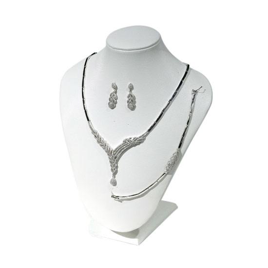 This is a set of fine jewelry that comes with a pair of earrings, a necklace and a bracelet. Each piece features a braided silvery embellishment with sparkling CZ stone accents. This jewelry set will a touch of elegance and style to your outfit.