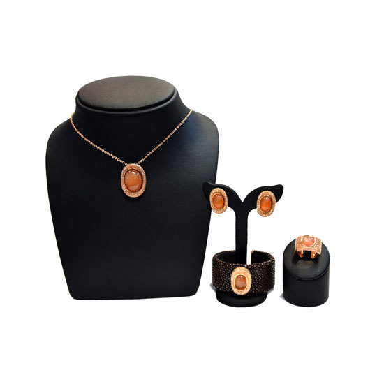 This is a jewelry set with a fashionable and charming design. It comes with a finger ring, a pair of earrings, a necklace and a bangle. Each piece features an orange moon stone centerpiece which is encircled with sparkling CZ stones.