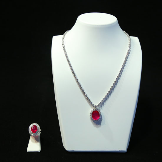 This is a stylish jewelry set with a ring and a matching necklace. It is finely crafted with dazzling diamonds and rubies for an elegant touch. This jewelry set is great for complementing your chic look.