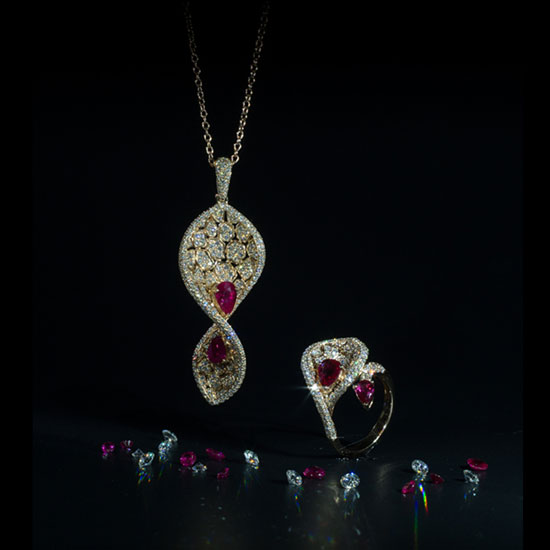 - Elegant ruby pendant and ring set that is designed with a swan appearance.