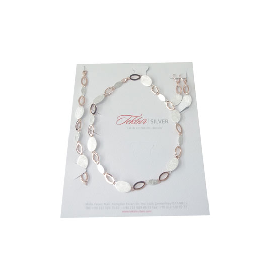This is a gold silver jewelry set with a bracelet, a necklace and a pair of earrings. It is finely crafted with delicate details for an elegant touch. This jewelry set is great for complementing your chic look.